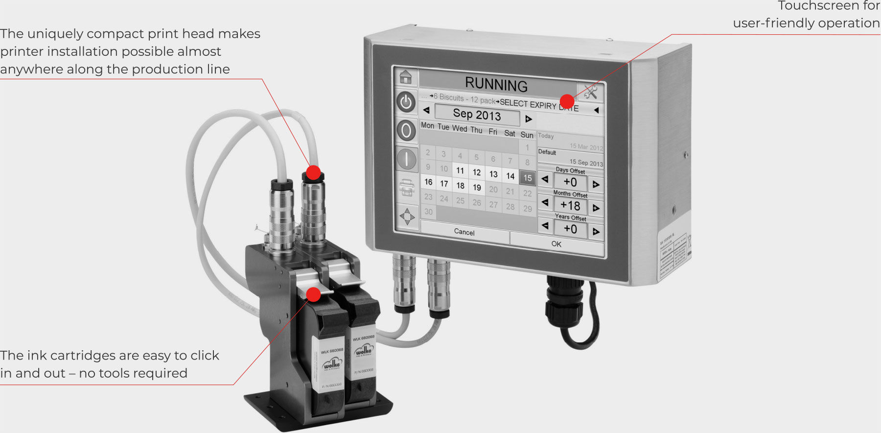 The printer can print texts, dates, times, batch numbers, barcodes, graphics and logos, and you print using the print heads separately or together, giving you many options when designing your layout.