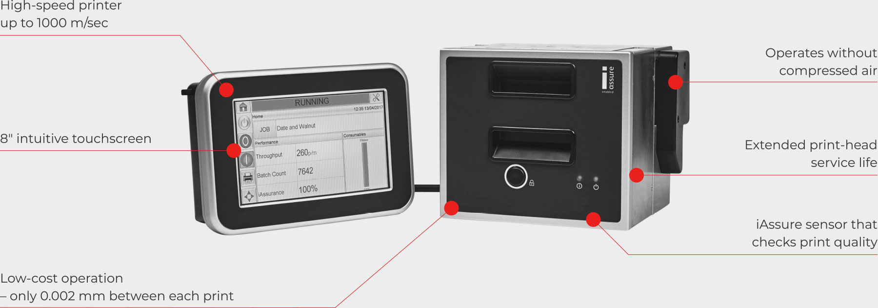 The printer is easy to integrate into your production line and is available in right-hand and left-hand execution. Print jobs are transferred to the printer via a network cable or thumb drive and the touchscreen makes it easy to operate.