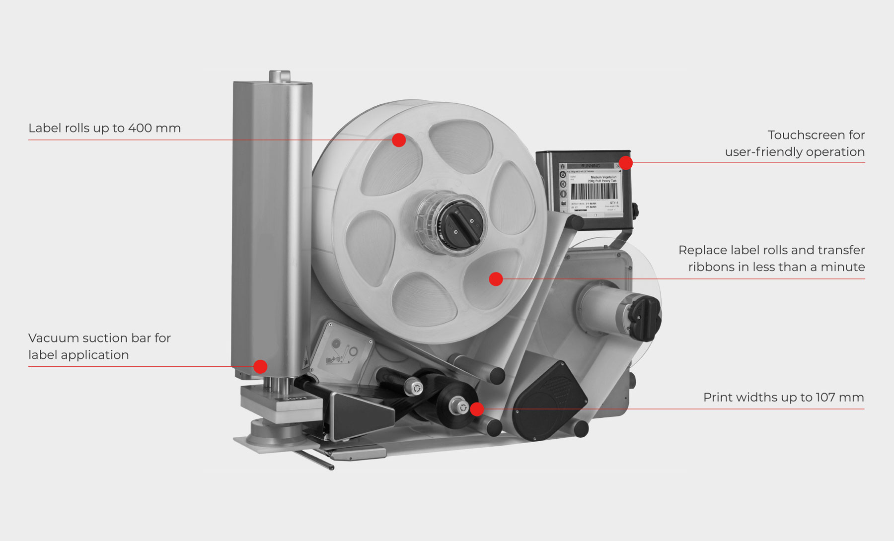 It can apply up to 60 labels a minute and is available in three print-width versions: 53 mm, 76 mm and 107 mm