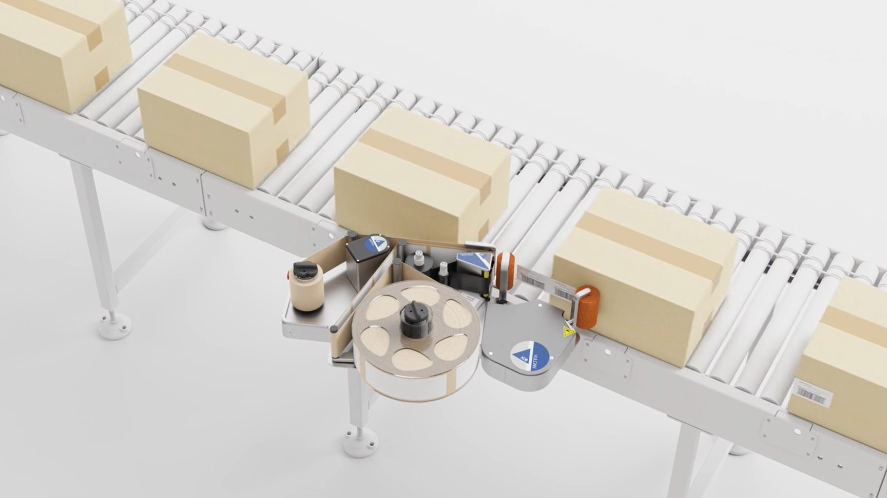 It prints texts, graphics and barcodes on the label after which it dispenses the label onto your product, and it is possible to combine label and print sizes. The label is dispensed and immediately followed by a rubber roller to firmly wrap the label around the corner of your product.