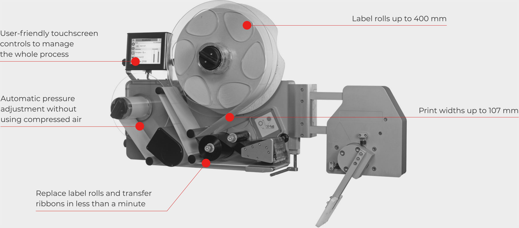 Both transfer ribbon and label roll can be changed in no time so your production process doesn’t stand still for very long. It can hold label rolls up to 400 mm in diameter. It has built-in code assurance, which minimises operator error, and the automatic pressure regulator optimises printing quality and print-head service life. Compared to other print/apply solutions on the market, the number of wearing parts is reduced by roughly 80%.