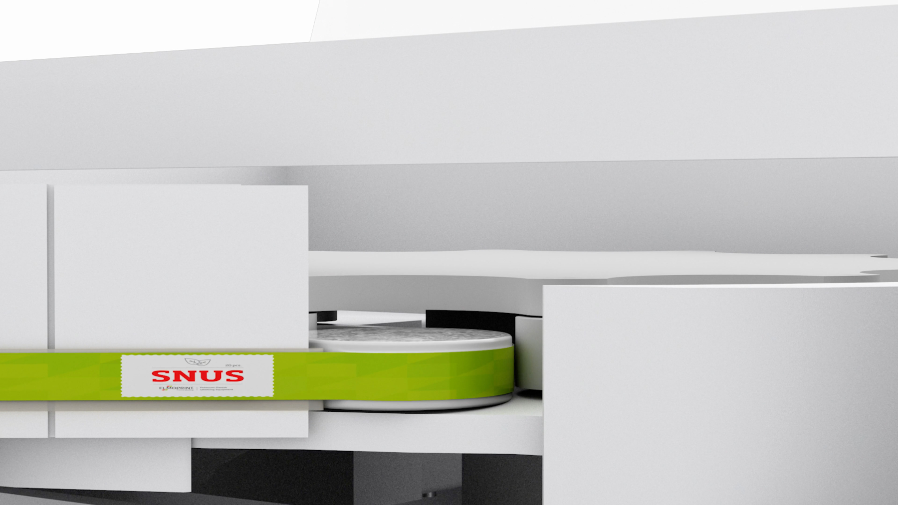 The starwheel rotates the products around three points, thus achieving the same high precision achieved by a triple-roller module. The starwheel solution has far greater capacity, however, because the products are indexed in the starwheel and don’t have to wait to be caught and released, as with the triple-roller module.