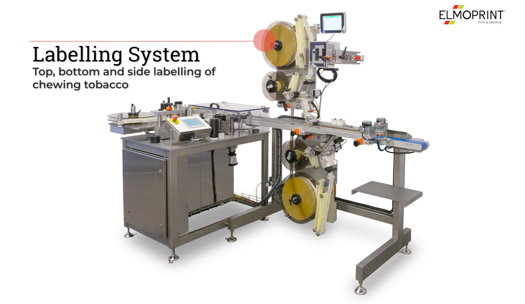 The equipment had to label small round snus cans on the top, bottom and around the sides of each can.