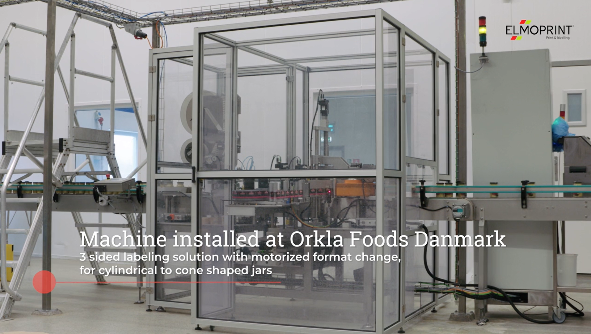 The side dispenser and side belt synchronise the speed and take care of rotating the jars while labels are being wrapped around the entire jar.